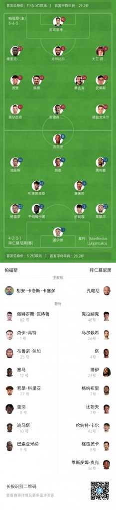 拜仁替补:26-乌尔赖希、48-克拉纳克、4-塔、7-格纳布里、8-格雷茨卡、20-比朔夫、23-博伊、36-维斯多姆·麦克、42-伦纳特·卡尔